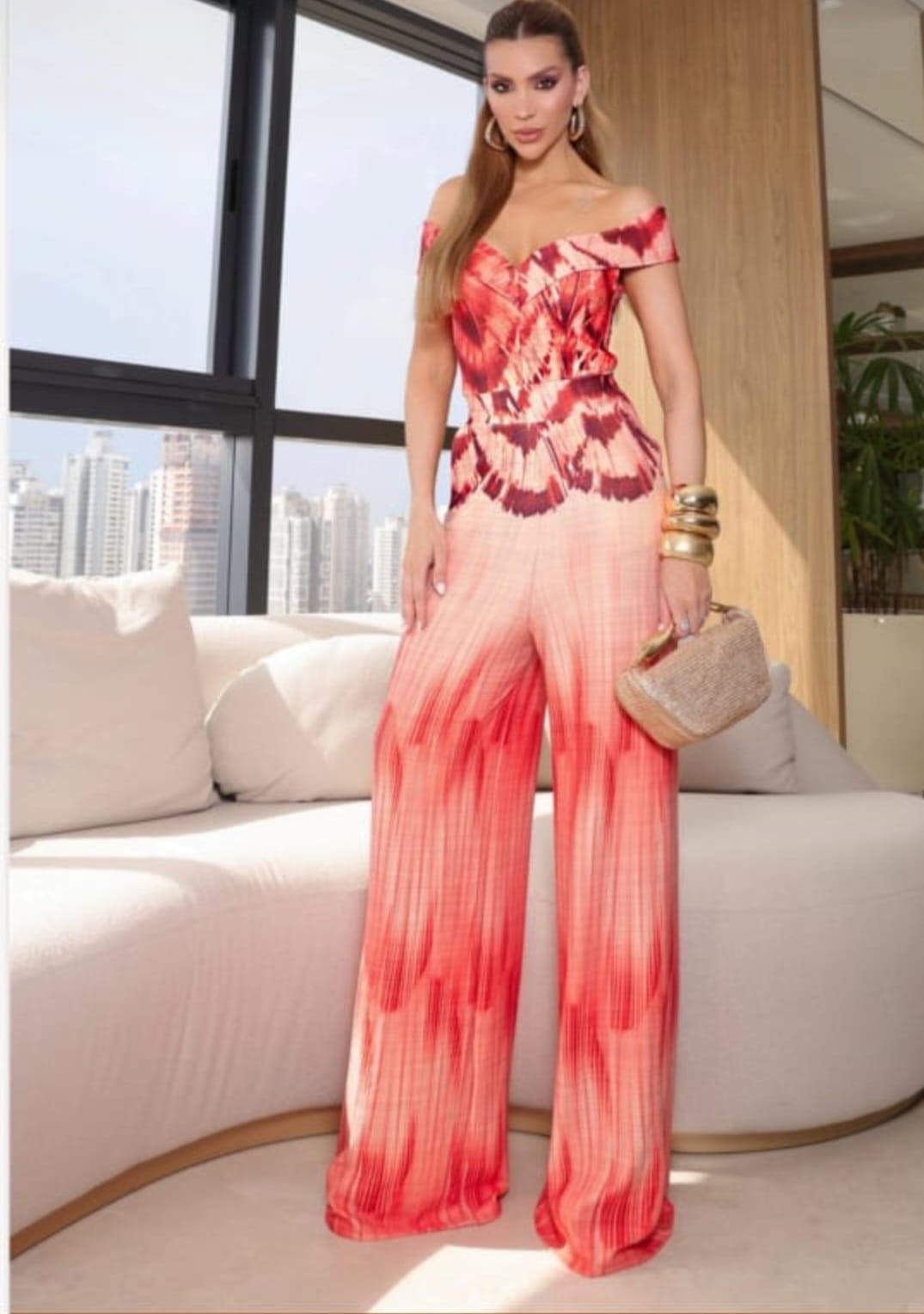 O Macacão Daly, é uma peça de cor laranja, tecido em crepe de malha.